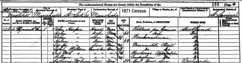 Piecing together the movements of Charles' mother, siblings and step-siblings during the 1870s starts with the information in the 1871 Census for Chorlton, Manchester where Charles' maternal grandparents, John and Helen Harper are living in retirement with some of their own middle-aged unmarried offspring and three Wilson teenage children from the Wilson-McLean marriage, including eldest son, John born in 1852.