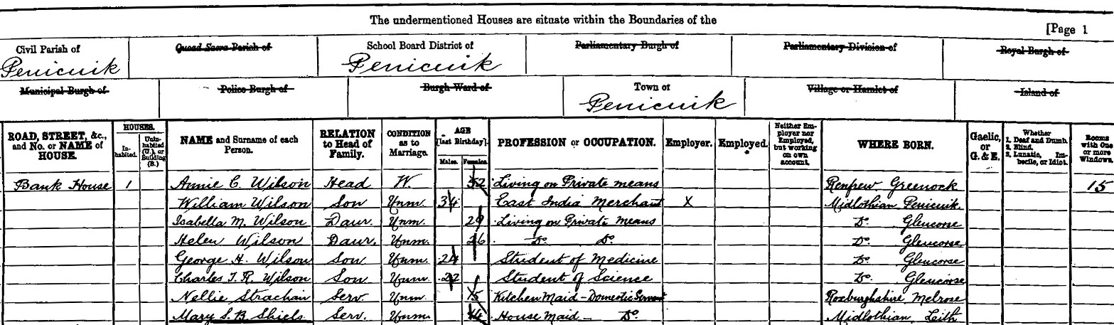 In the 1891 Census for Bank House, Penicuik, Annie has her own three grown-up children, Helen, George and Charles with her, plus step-son William, and step-daughter Isabella.