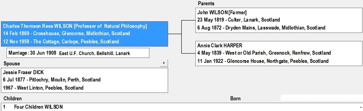 Career and Genealogy of Professor Charles Thomson Rees Wilson (1868-1959) of Glencorse, Midlothian, the, as yet, only Scottish Nobel Prize winner.
