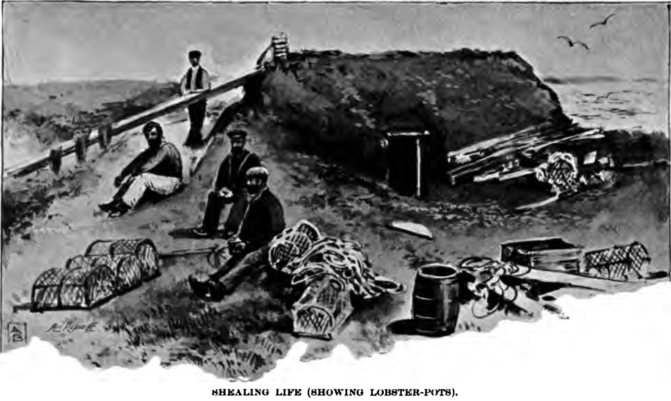 Often in the Islands, one notes a brighter colour on the heather, or a greener shade upon the grass in some wild spot just above the rocky shore, denoting the former occupation of the spot by a group of shealings, perhaps for the pasturage of cattle, I am told, though I have not seen them, that on the machair of the west coast of South Uist there are earth dwellings, which are used as shealings by kelp-workers.