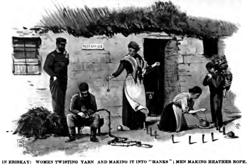 Reeds grown in the lakes must not be used for thatch, or a death is sure to follow speedily either in house or byre. Inside the roof they add hay for warmth, and we have seen here very neat and comfortable dwellings, well kept and with many small comforts, generally brought home by the girls after the east coast fishing.
