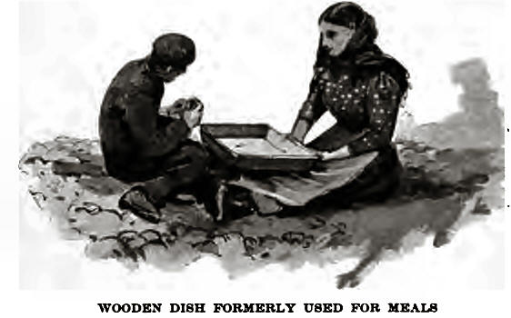 that when the minister came from Lochs every third Sunday, it had to be sent for from Dalebeg, three miles away; the people ate out of a trough, such as we have seen (though not now in use) in Eriskay. Whisky was made from oats, which were cut with a sickle, but the barley crop was plucked up by the roots. The grain, if wanted at once, was dried in a pot over the fire, and ground in a handmill, but generally there was a kiln or two in every township.