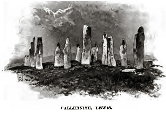 Lewis, however, has historical monuments beside which even the clan Macleod is of modern growth. The Standing-stones of Callernish, the Stonehenge of the Hebrides, are among the most famous in Britain. They are situated in a wild spot on a tableland somewhat raised above the peat bog which encircles them for miles. A few houses are clustered at the foot of the hill beyond, and there is a little temperance inn, where the friends of the Princess of Thule, on their way to Loch Roag, mysteriously drank whisky. The name Callernish at once suggests a Norse derivation, the affix nish generally denoting a point; but those who would seek a more remote origin for this mysterious monument derive the name from call, a circle, aim of the judge, and gheis of sorcery; hence Callaimgheis, which would denote a place of assembly or of judgement. Though the depth of the slow-growing peat which surrounds the base of the stones (we were told that some six feet had been cleared away) would suggest a more remote antiquity, many think that it is of Norse origin, for small counterparts of this monument are pretty frequent in Iceland, where they are variously regarded as battle-sites or as places of assembly. The ground plan is that of a recumbent Iona cross, that is, a Latin cross with a halo encircling the junction of the arms, the top of the cross pointing almost due west. Hence there are some advocates for the theory that it is of Columban origin. The whole question of such stones is so wrapped in mystery that one can only state the direction of conjecture. Possibly the following theory of the “Indweller ” may however be eliminated.