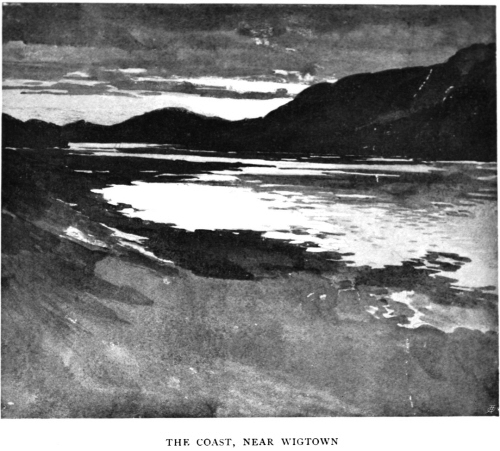 The lakes of Lakeland are fewer, larger-more intentional, as it were, on Nature's part. But in Galloway, whenever you conquer a mountain summit, there is every chance that you will find a “Dhu Loch" lying a few steps beneath you, with chance flaws from the clouds of the hill face playing upon it. A typical Galloway loch is Loch Valley, which flashes upon the traveller like the transformation scene of a picture as he mounts one of the little hillocks of " jingling stones "–the Loch Valley "terminal moraine," about which geologists have so much to say. How far it appears to reach from east to west, running beneath the rocky Jarkness from horizon to horizon, the wild treeless slopes of the ancient Forest of Buchan closing it in ! Above it there is only the desolation of the older land towards Enoch and the stars. And may all the gods of solitude defend the passes, that the rail come no nearer to birch-fringed Trool and the white water of Gairland, where it leaps down its lonely steep and hastens to the loch between grassy banks, under which the shy trout sulk and upon which the bog-myrtle grows.