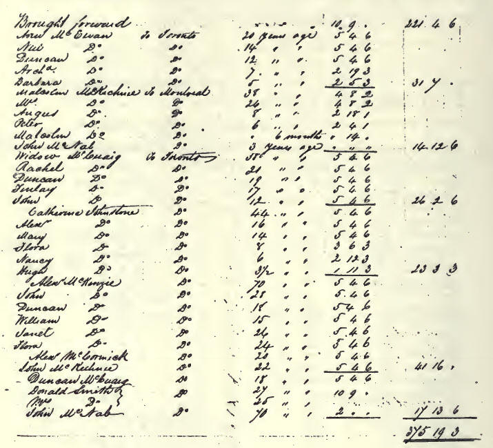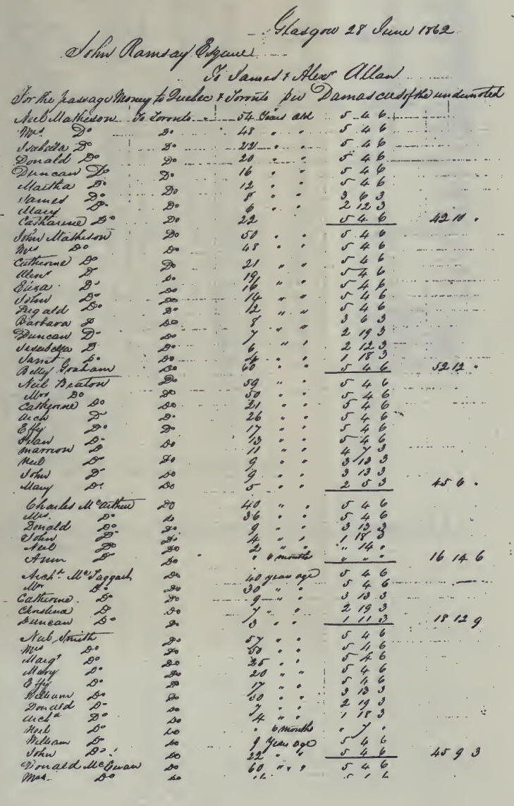 List showing the passengers on S.S. Damascus who had their fares to Canada paid by John Ramsay Esq.