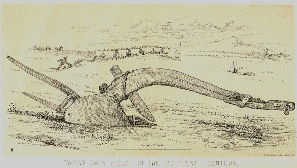 The sketch of a twelve oxen plough, which forms the frontispiece, is from the skilful and accurate pencil of Mr. Andrew Gibb, F.S.A., Scot.; and was taken from the specimen in Marischal College Buildings mentioned at page 33. The beam remained entire at date of drawing; the stilts, &c., had to be somewhat helped out from the parts of them still extant, and a certain measure of traditional knowledge. And as the plough is drawn to scale, readers interested in such matters, and who care to do so, will be able to compare its size and the proportion of parts with those of the improved plough of the present time.