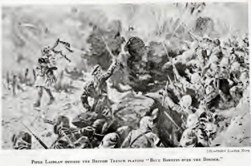 The battle of Loos, which accounted for the loss of so many pipers as well as of other combatants, enabled Piper Daniel Laidlaw, a veteran serving with the 7th Battalion, to distinguish himself by doing that which so many heroic pipers have done in all wars — playing such airs as would inspirit his comrades to victory. The men, crouching in their trench, stupefied by gas, saw Piper Laidlaw walking up and down the parapet of the trench, heard the invigorating strains of “Blue Bonnets over the Border,” and, hearing them, forgot all but the instant desire to be up and at the enemy. Over the top and off at the double, they heard parts of the “Standard on the Braes o’ Mar,” though, by then, Laidlaw had been wounded.
