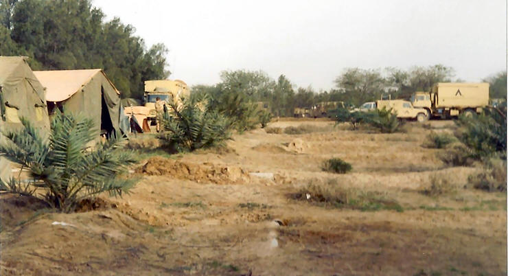 Our Divisional HQ was in a plantation on the coast just north of Kuwait City, comfortable enough as far as living in the desert goes. It consisted of the usual Ops tent complex, plus a ragtag collection of tents, trucks, and assorted military and civilian vehicles parked in among the scruffy palm trees. I knew quite a number of the staff, and they seemed to be in fine fettle, if a little weary, and very pleased it was all over. I spent some time working with them, and then turned in for the night in a small tent shared with two others, a tight squeeze exacerbated by the fact there seemed to be a complete arsenal of captured Iraqi weaponry in there too!