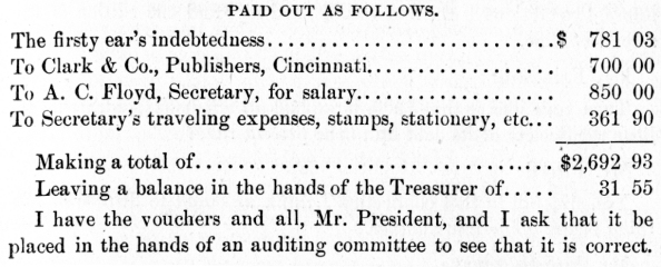 Mr. Chairman and Gentlemen: I had supposed that this additional information necessary to make the situation plain to you would have gone as part of the Treasurer's report; but as it has not, I will give it. The report shows a balance of something like $31. I don't give the exact figures because I don't know them, but there are outstanding debts which I estimate, in the rough, at about $600; out of that would be a balance on salary referred to; about $50 of it would be for some outstanding small accounts, and about $400 is due the publishers. In that connection it will be necessary to state that this $400 has been incurred very recently by the necessity, at a very late date in the year, of issuing extra editions of the first and second volumes from Robert Clark & Co., which are now on hand. It became necessary for us to have a second edition of the second volume and a third edition of the first volume. These editions have been issued very recently, and the copies themselves are most of them on hand now. I estimate that the books we have on hand are worth about $400 if they could be disposed of, so that you have an indebtedness of $600 less $400 in books, if it is possible to sell them, and I think it will be from the fact that the books have been sold here tofore, two editions of the first volume, as I say, and one edition of the second volume.