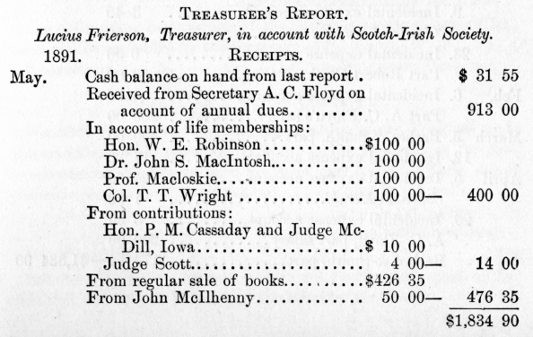 The Executive Council of the Scotch-Irish Society held a meeting immediately after the adjournment of the Congress and elected the following Executive Committee to serve for the ensuing year: Robert Bonner, President; Br. John S. Macintosh, Vice President General; A. C. Floyd, Secretary; John McIlhenny, Treasurer—ex officio members; Prof. George Macloskie, Princeton, N. J.; Col. John W. Echols, Pittsburg, Pa.; Dr. John W. Dinsmore, Bloomington, Ill.; Dr. Robert Pillow, Columbia, Tenn.; Mr. Helm Bruce, Louisville, Ky.; Mr. W. Hugh Hunter, Dallas, Tex.; Col. William Johnston, Charlotte, N. C.