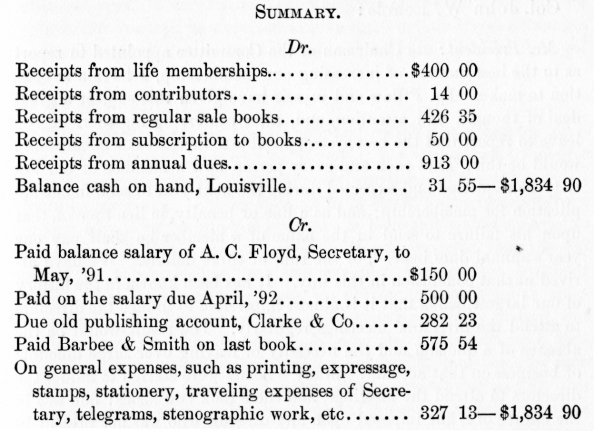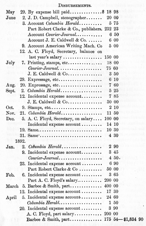 The expenditures for the past year amount to $1,834.90, including the following items: $933.31 for printing and sending out annual proceedings, and for papers containing the report of the proceedings of the Louisville Congress sent at that time to absent members; $251.53 for stamps, stationery, and other office necessaries and traveling expenses of the Secretary and members of the Executive Committee; $150 for balance of Secretary's salary, and $500 on salary for the present year.
