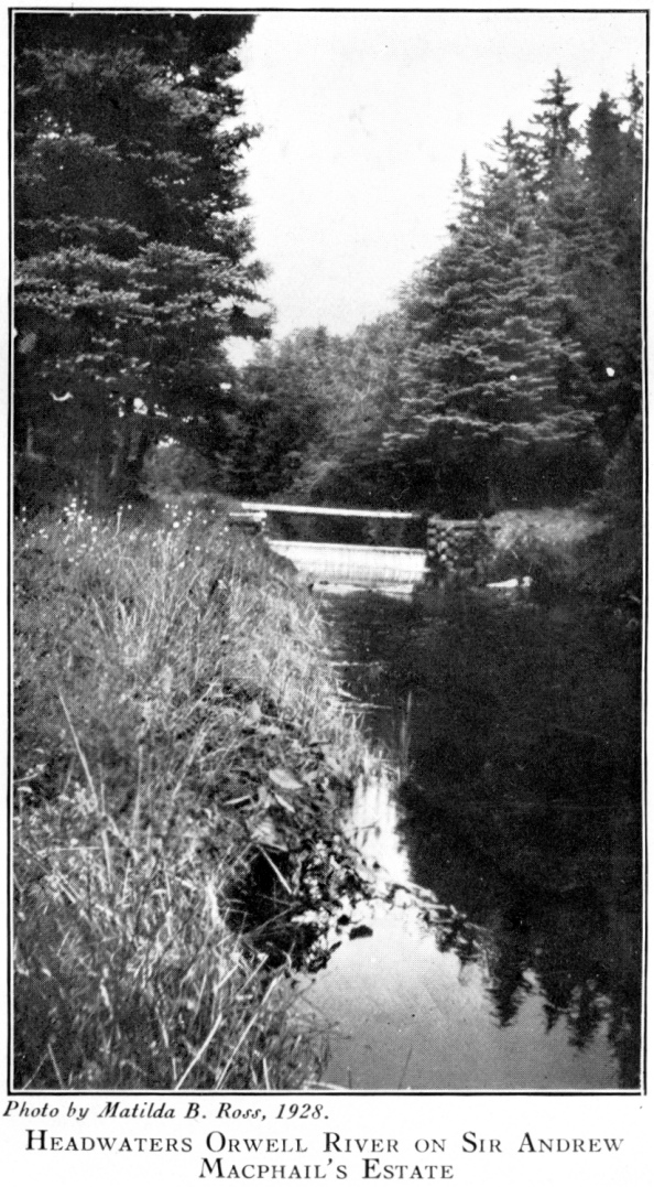 Beloved by all for his genial good nature, Peter Nicholson left this charming estate of 250 acres to his widow, Marion Munro, and three daughters. Marching for over a mile along both banks of the river from the Murray Harbor road westerly towards the sea, this tract of land was then, as it is today, a spot unsurpassed for quiet natural beauty. A few years ago it was purchased by Sir Andrew Macphail, who, using it as a summer retreat, indulges his poetic fancy along its shady banks in pursuit of the delectable sea trout for which, from time immemorial, it has ever been famed.