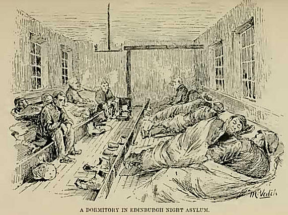 When a tramp shuffles into Edinburgh, from whatever point of the compass he comes, he usually makes his way at night to the Night Asylum in Old Fishmarket Close, adjoining the Police Office. There he takes his place among a waiting crew of poor wretches, who, like himself, are without place to lay their head.