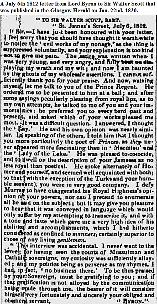 1830, Jan 22 A July 6th 1812 letter from Lord Byron to Sir Walter Scott
