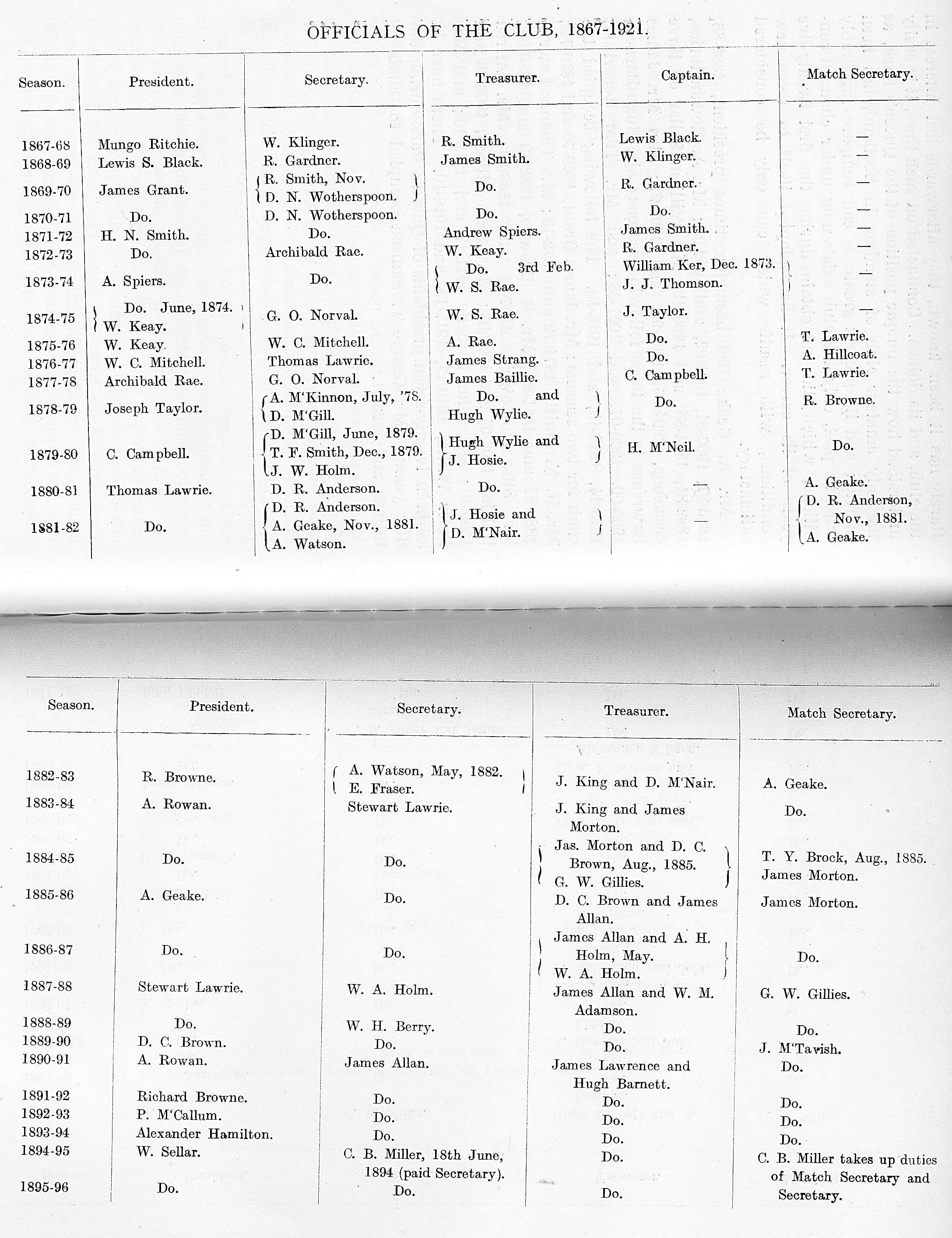 In scanning the following list of office-bearers who have steered the Queen's Park from its birth to the triumphant celebration of its jubilee, through many trials and troubles, counterbalanced by bright flashes of success and glorious achievement, it will be seen that all, without exception, have been men possessed of great abilities, business keenness, and, best of all, the true amateur spirit. All the offices of the club were discharged in an honorary capacity, until it was found that the work was too great for the spare time the holders could devote to the proper performance of their duties. This applied more particularly to the offices of secretary, treasurers, and match secretary. The first and the last of these duties devolved on the paid secretary when he was first appointed in 1894. It would be invidious to state that one honorary official was more competent than another in his own department, where all conducted the affairs of the club with so much ability. Some presidents had comparatively quiet reigns, while others again had their lot cast in strenuous times, and were presented with difficulties which had to be faced courageously, and were successfully overcome. The financing and building up of the three Hampden Parks required great business acumen, both on the part of the officials concerned, and the whole general committee of the club. As for the match secretaries, their office was a most important one, as on them depended the success or failure of the club, as no club which does not maintain its position on the playing fields can hope to retain its popularity. Then there was always that esprit de corps which bound every man in a common bond to uphold the prestige of the club, and hand the name of Queen's Park down to his successor with undiminished lustre. And these officials, having accomplished their mission, dropped out, and left room for men equally able, and equally enthusiastic.