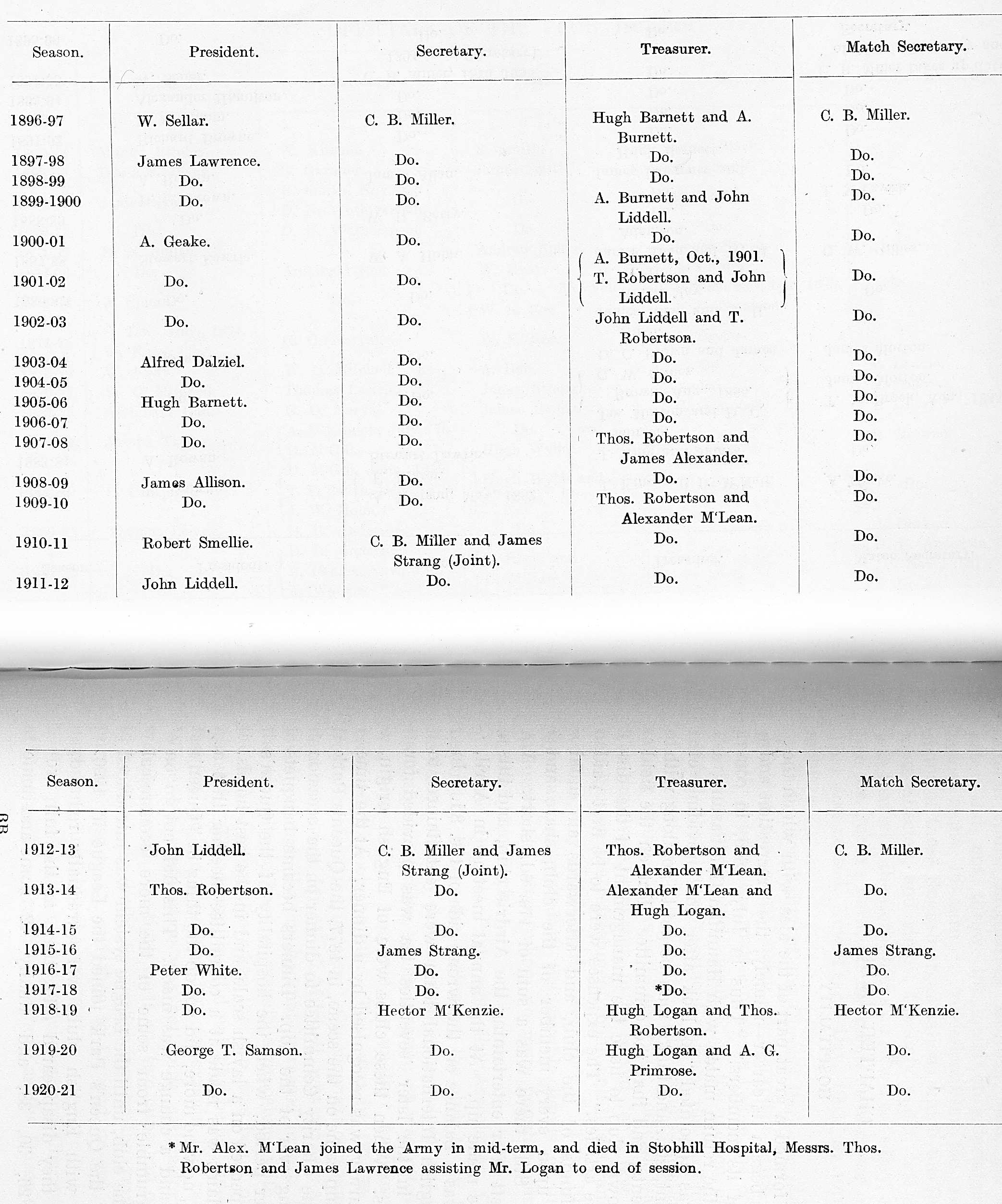 Mr. A. Geake has been five times president, 1885-86, 1886-87, 1900-01, 1901-02, and 1902-03; Mr. A. Rowan thrice, 1883-84, 1884-85, and 1890-91; Mr. William Sellar on three occasions, 1894-95, 1895-96, and 1896-97; also Mr. James Lawrence in the three following seasons; Mr. Hugh Barnett, 1905-06, 1906-07, and 1907-08; and Mr. Tom Robertson, 1913-14, 1914-15, and 1915-16. The following occupied the chair for two seasons: Mr. James Grant, 1869-70 and 1870-71 ; Mr. H. N. Smith, 1871-72 and 1872-73; Mr. Thomas Lawrie, 1880-81 and 1881-82; Mr. R. Browne, 1882-83 and 1889-90; Mr. Stewart Lawrie, 1887-88 and 1888-89; Mr. Alfred Dalziel, 1903-04 and 1904-05 ; Mr. James Allison, 1908-09 and 1909-10; Mr. John Liddell, 1911-12 and 1912-13; and Mr. Peter White, 1916-17, 1917-18, and 1918-19. There have in all been twenty-seven presidents of Queen's Park during the fifty years. Mr. George T. Samson occupied the chair in 1919-20 and 1920-21.