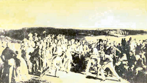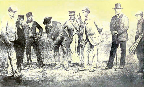 This exhausts those members of the group on the right hand of the foursome. In the distance a match is seen coming in. That there must be some good players in it may be inferred from the fact that it seems to have a considerable following. To the left of the picture St Andrews is seen in the distance. Of the group in the foreground to the extreme left is Sir John Muir Mackenzie of Delvine, Bart., and Sir John Murray Macgregor, Bart. The third member of the little group with the two ladies is Mr Tyndall Bruce of Falkland. He is looking "sideways" at the holing out. Sir Charles Shaw is standing far back, just beside the head of the horse which is ridden by a lady. Next to him, with a tall white hat, is Colonel Playfair, of St Andrews.