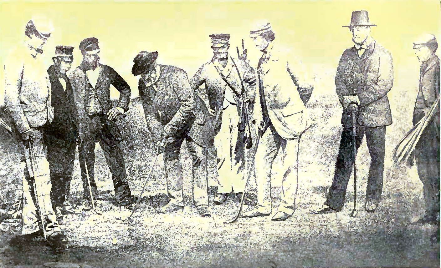 Next to him, also with a tall hat, is the one who has evidently just made his putt. It is Major, afterwards to become Sir, Hugh Lyon-Playfair.