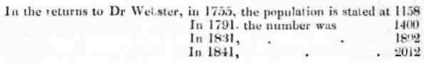 The people resident in the village, and throughout the parish, are, in general, healthy ; and some of them have reached a great age, being upwards of ninety. They are distinguished for their moral and correct conduct, and their orderly and industrious habits. They are constant in their attendance on religious ordinances, strictly observe the Sabbath, and have always shown a laudable desire for the religious education of their children, and not a few have had the benefit of an university education. In proof of this, there are alive at present, three clergymen of the Established Church, having the charge of parishes, and five probationers, all natives of this parish.