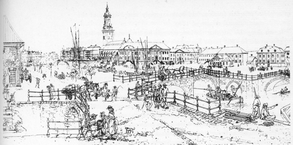 The inner harbour of Gothenburg.  Detail of engraving by Elias Martin's