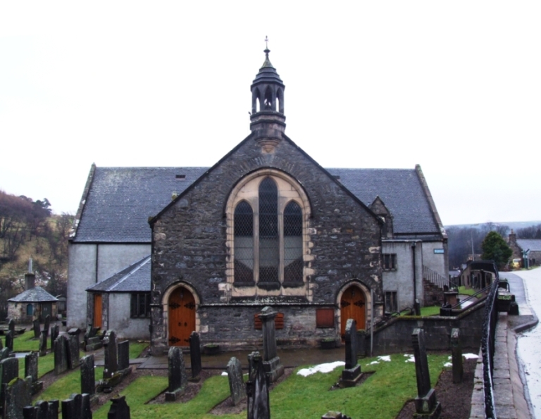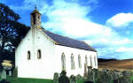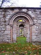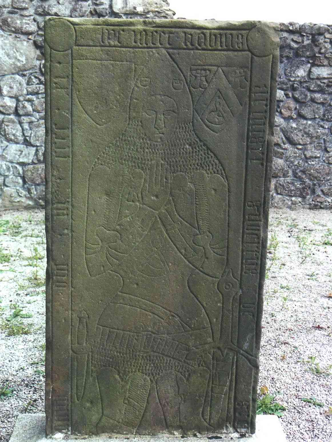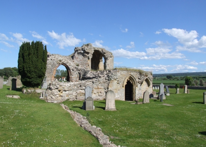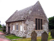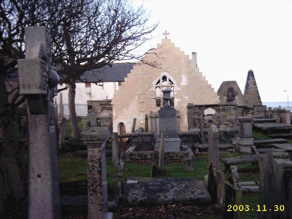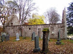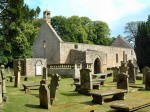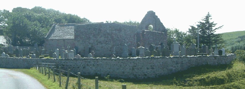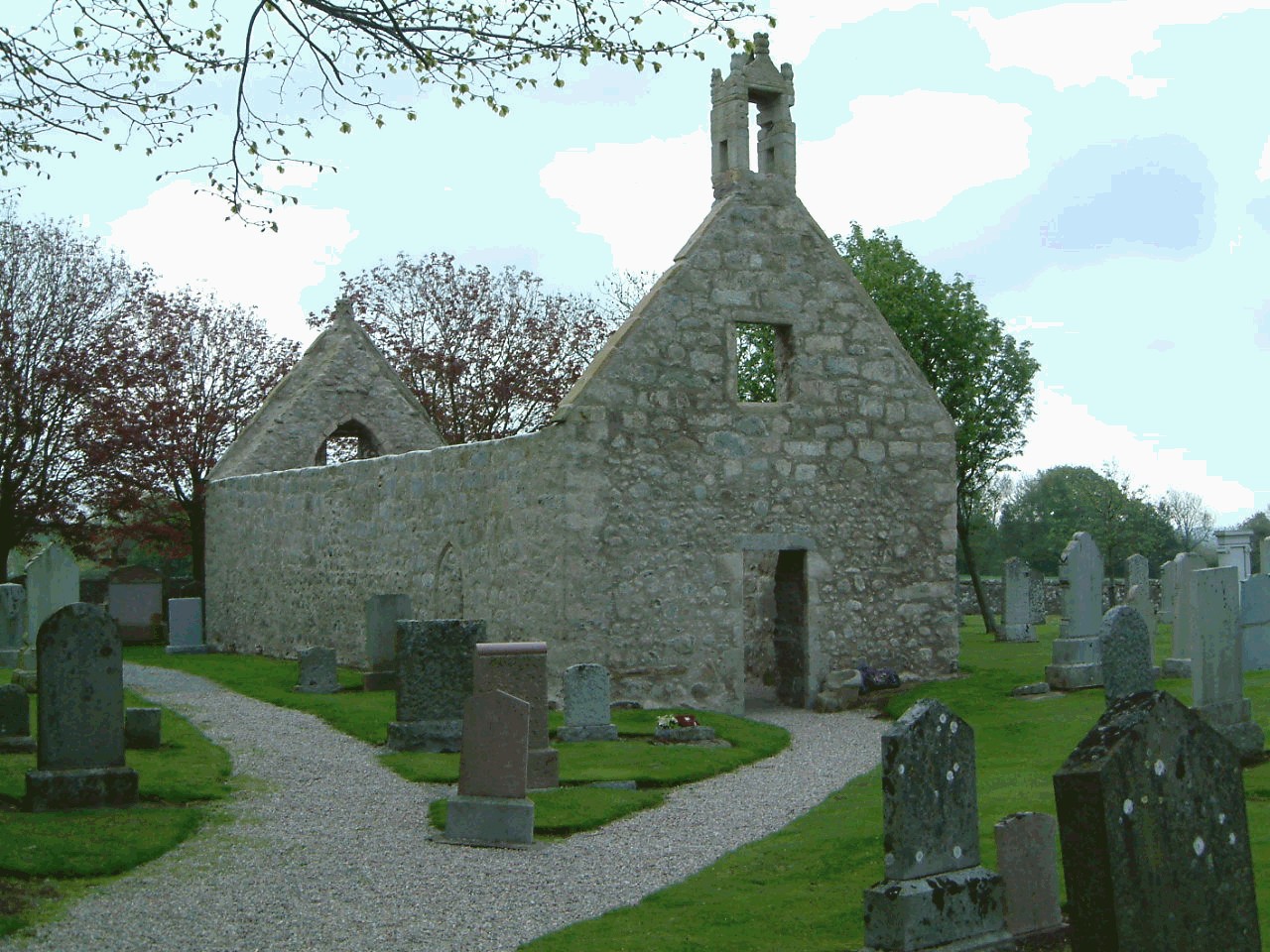 The roofless remains of the kirk include the base of a 14th century westewrn tower, a
