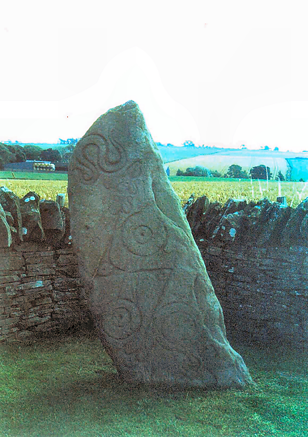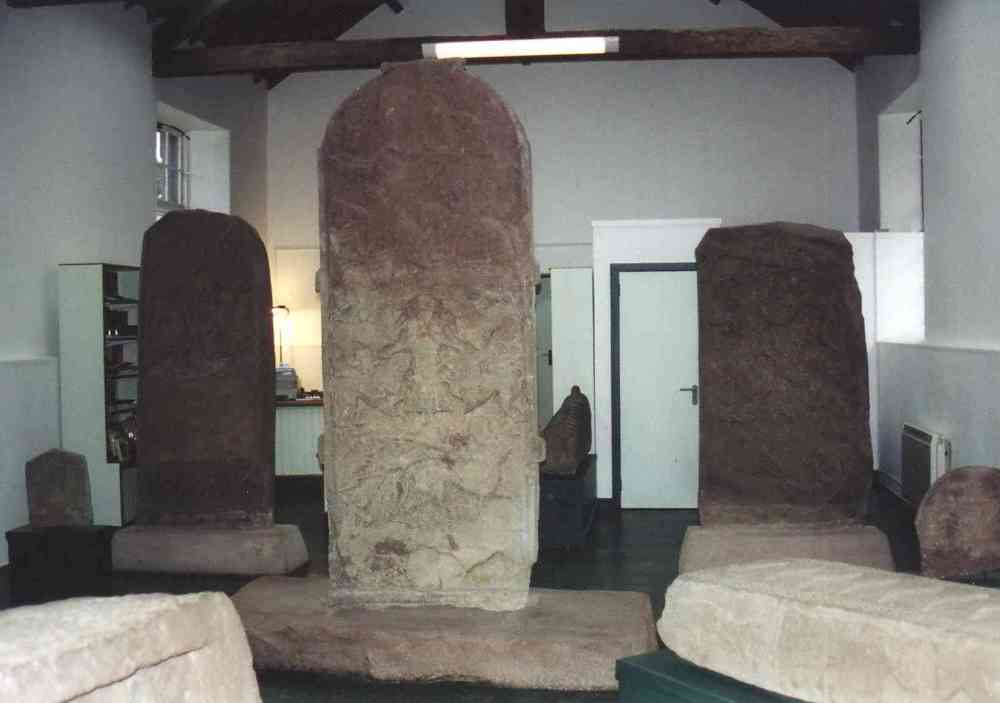 and Pictish symbols and figure sculpture on the other. Three other stones, covered in