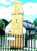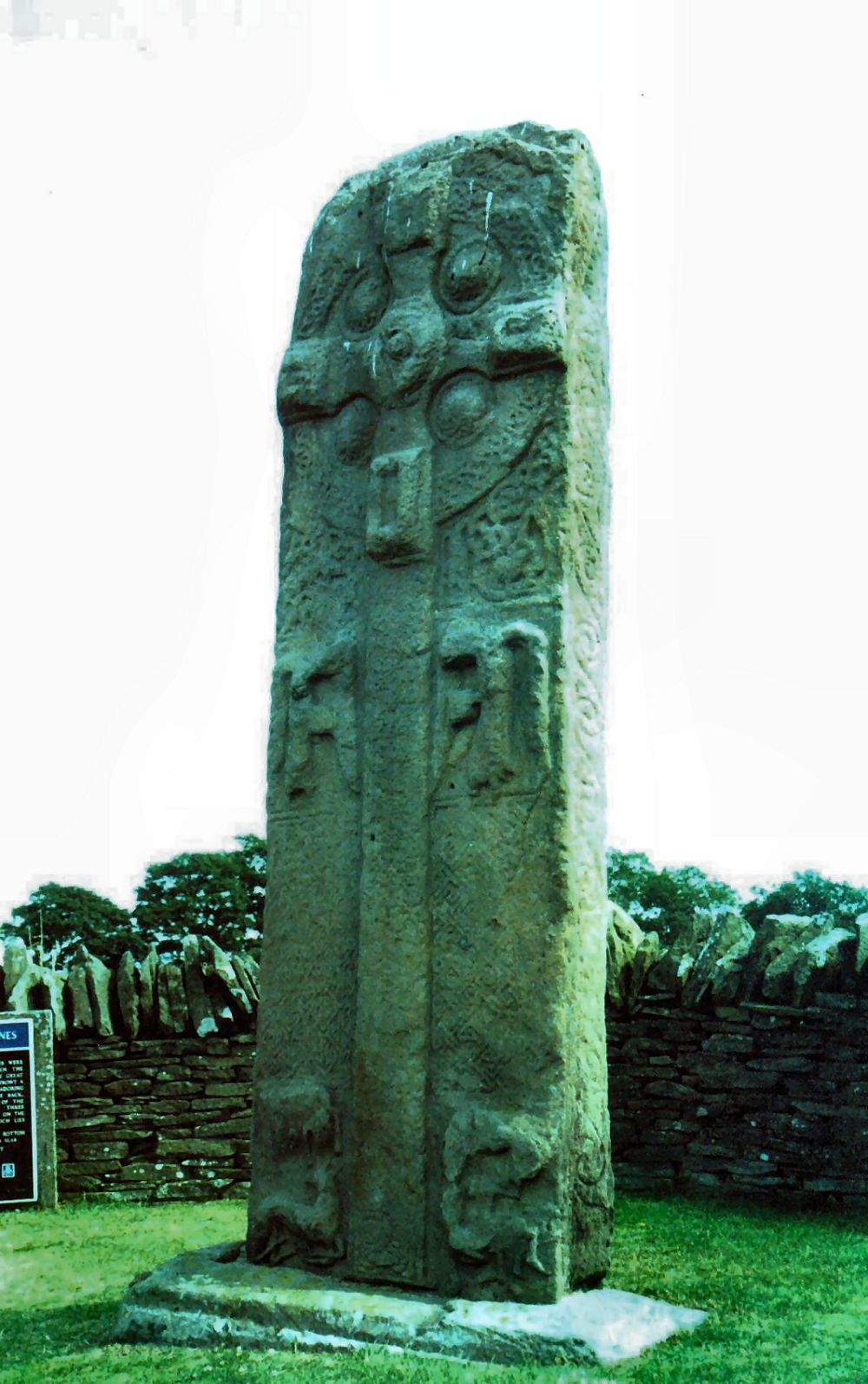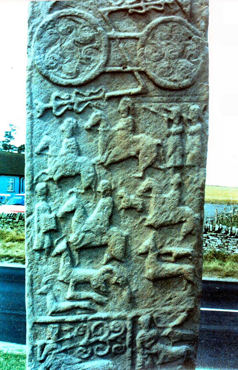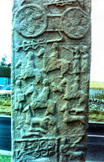A fine Pictish sculptured stone with a cross on one face, and figures on both faces.