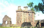 section of defensive barmkin wall and a remarkable corner tower with a square cap-house