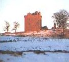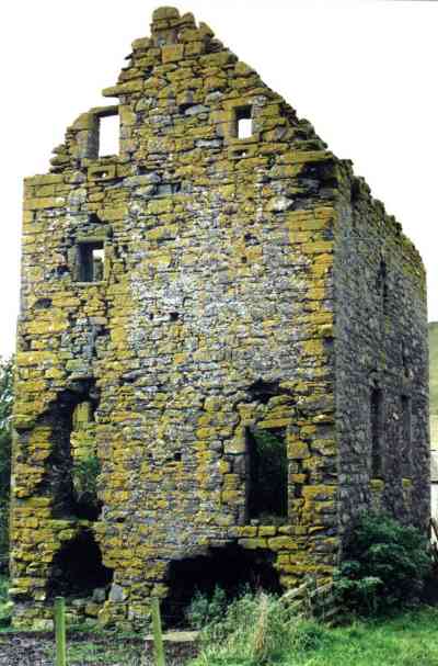 The roofless but otherwise complete ruin of a tower house of about 1500, with a