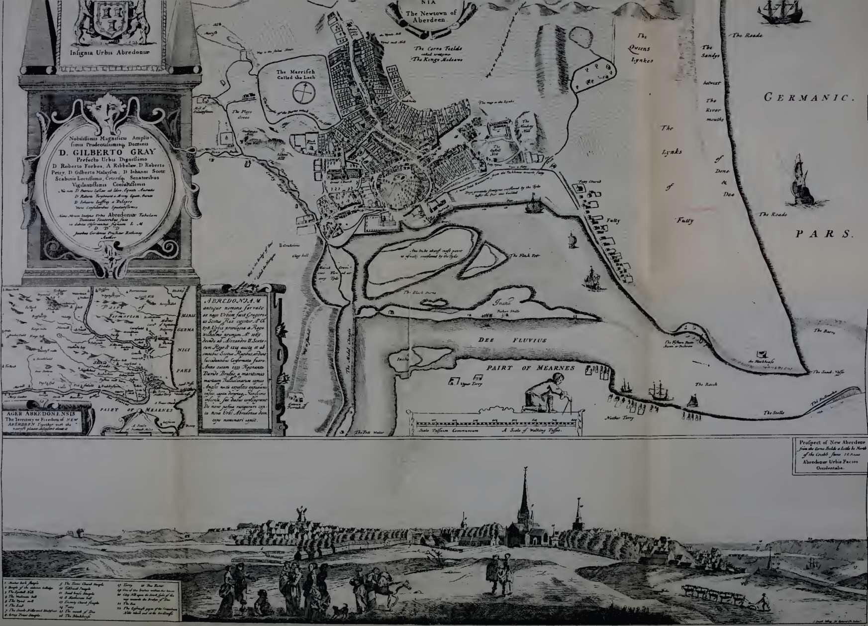 To James Gordon, parson of Rothiemay, son of Gordon of Straloch the Scottish topographer, we are indebted for an exact description of " both towns of Aberdeen," written shortly after the middle of the seventeenth century, and for a plan of the city as it then stood. In earlier times the low ground near the Dee had been occupied with houses, but gradually the Gallowgate Hill (called also Windmill Hill), Castle Hill, and St Katharine's Hill had been built upon, until in Gordon's time the best part of the city stood upon or between these eminences. The streets and lanes had not been laid out according to any regular design, but were neatly paved with a "grey kind of hard stone not unlike to flint," the buildings were "of stone and lime, rigged above, covered with slates, and mostly of three or four storeys' height, some of them higher." Wooden buildings, which were numerous in the preceding century, had now gone out of fashion, though numbers were in existence at a much later date, for it was not till after a great fire which destroyed the west side of the Broadgate in 1741 that the erection of houses having their outside walls of wood was finally prohibited. "The dwelling-houses," Gordon goes on to say, " are cleanly, and beautiful, and neat, both within and without, and the side that looks to the street mostly adorned with galleries of timber which they call forestairs. Many houses have their gardens and orchards adjoining; every garden has its postern, and these are all planted with all sorts of trees which the climate will suffer to grow; so that the whole town, to such as draw near it upon some sides of it, looks as if it stood in a garden or little wood." Admiration is due to an example of public spirit in adding to the attractiveness of the town on the part of Jamesone who, finding that a piece of ground called the Playfield, " where comedies were acted of old beside the Well of Spa," was being destroyed by flooding from the Denburn, feued it from the town, embanked it against inundation, laid it out as a garden, planted it with trees, and bequeathed it to the community as a place of public resort. A daughter of Jamesone, it may be added, is believed to be the artist in needlework who sewed the beautiful tapestry that still decorates the wall of the West Church of St Nicholas.