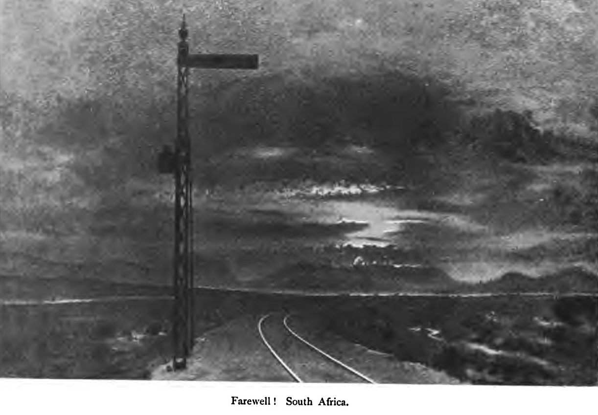 On 25th May we entrained for Cape Town, and on our arrival were immediately put aboard the transport "Tintagel Castle," which sailed the same night. The Ayrshire men followed us ten days later. About fifty of our company came home together, the rest had mostly got their discharges and sailed before us. Though but a handful among I2oo English Yeomanry we made our mark on board, winning the tugo'-war competition, and causing great wonderment among the "Sassenachs" by holding a Presbyterian service amongst ourselves at which the lessons and sermon were poems from Burns.