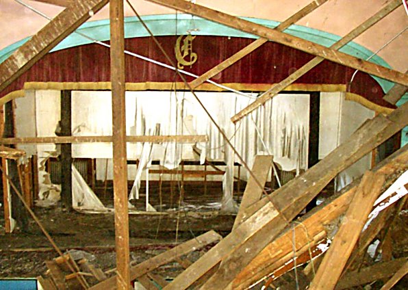broken windows remains. The old maroon velvet curtain still hangs across the