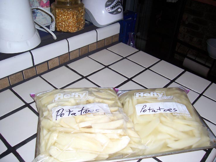The second picture shows the potatoes after they are in a gallon sized plastic bag. Add as much of the water with the Fruit Fresh in it where you have been soaking the cut up potatoes. Cut up French fry potatoes can be purchased but not at 1.00 a bag which is what this savings amounted.