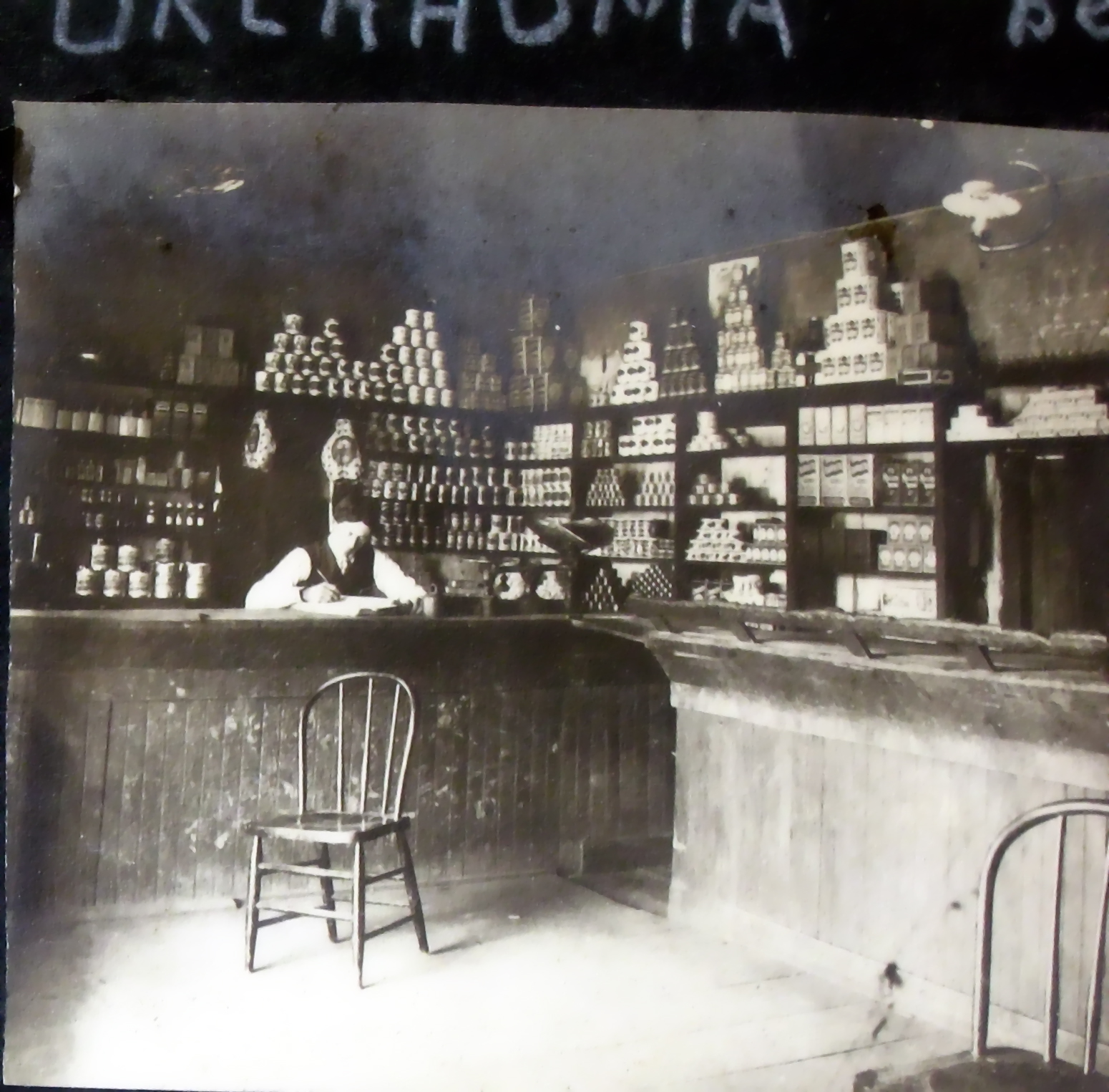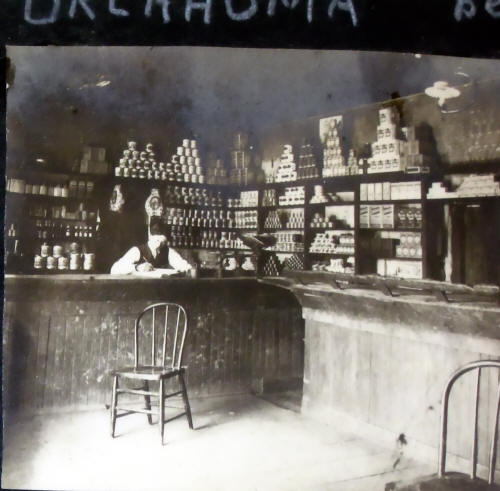 Interior of Steele Brother's Store. The photographs are a study of how the American government was functioning at the time by bringing these amenities and culture of theirs to the reservations. It is remembered by some of the older ones how there was a picture of a bear on the cans of pears, thus pears were named man-chu, the word for bear.