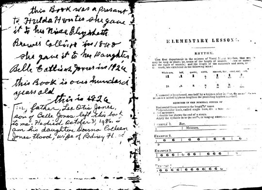 The HymnalThis little hymnal has a lovely story to tell all its own.  It is a story about the love these women had for each other and for their children.  There was an old poem Bellzona saved which said,  "she would have died for her sons."   Velma Jones, Bellzona's daughter in law said,  "that told the story about Bellzona, she would have too."  This is nothing unusual or rare but rather is very much what the women all did.  They fought lonely battles, fortified with a Bible and if fortunate a hymnal like this.  They trusted in a higher power to take them through the struggles of the early days before super markets,  day care,  women's rights, and even counselors. Some of the other things saved of Elizabeth Brewer Collins, Mrs Nathaniel Stewart Collins were old fragile one page letters, her old Bible, and a few pictures. Her mother, America Brewer, Mrs. John Brewer is on the 1870 census at Bolivar, Missouri, Polk county.
