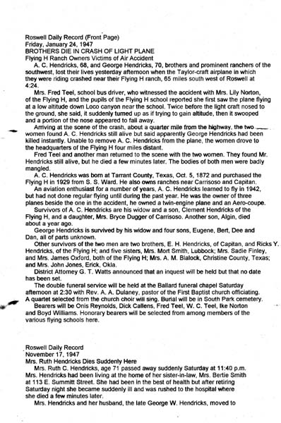 killed with his brother, the late A.C. Hendricks, in a plane crash while