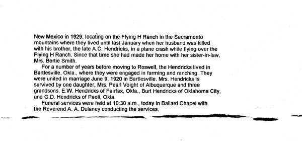 Hendricks is survived by one daughter, Mrs. Pearl Voight of Albuquerque
