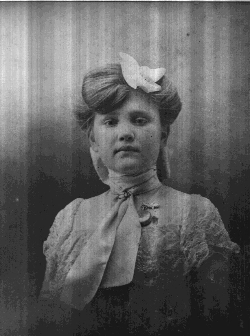 This girlish picture of Gertrude was taken around and about the age of fourteen which would have been about 1904. Gertrude's father, Joseph Hubbart Jones worked for the post office in Grandberry, Texas. The family migrated from there up through the Red River Valley then on to around Guthrie Oklahoma at the time of the land run. They then settled in and around Guymond, Oklahoma which is close to the Panhandle. Bellzona was industrious and all the pictures show the children well dressed. Gertrude learned these things from her mother since her children always looked well groomed with her own sewing ability. Bell did teach the young girls to use a needle at the earliest age, starting with hand hemming tea towels. Crochet would be taught by using the string from gift wrappings. The resulting shiny doily was a pleasure for the child.