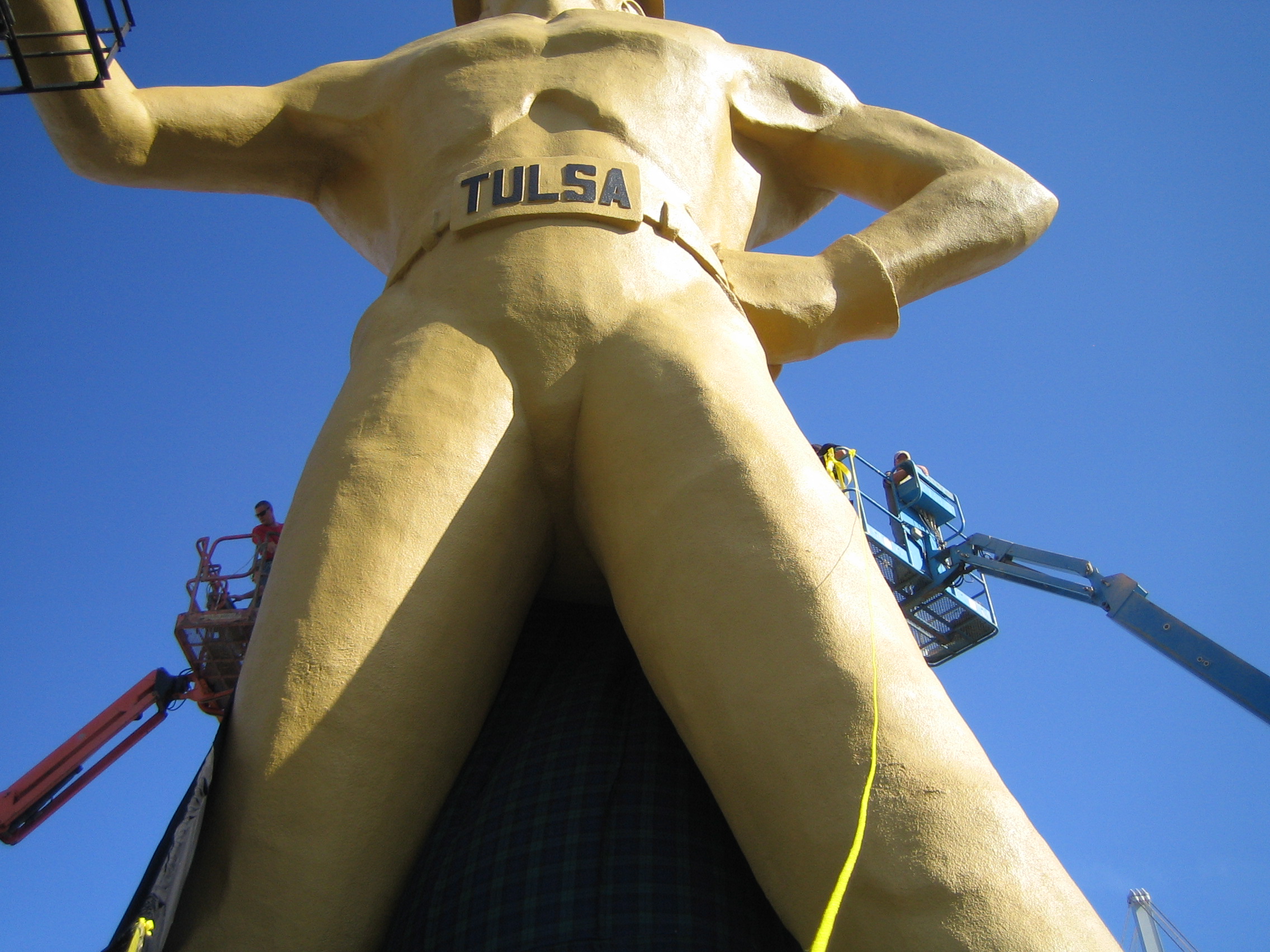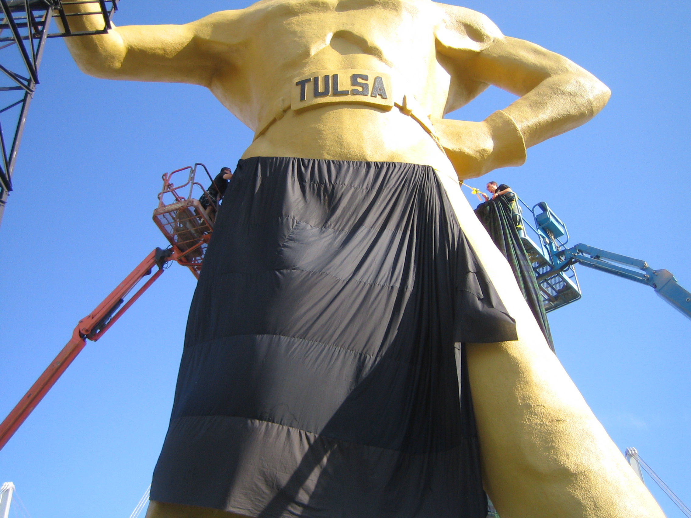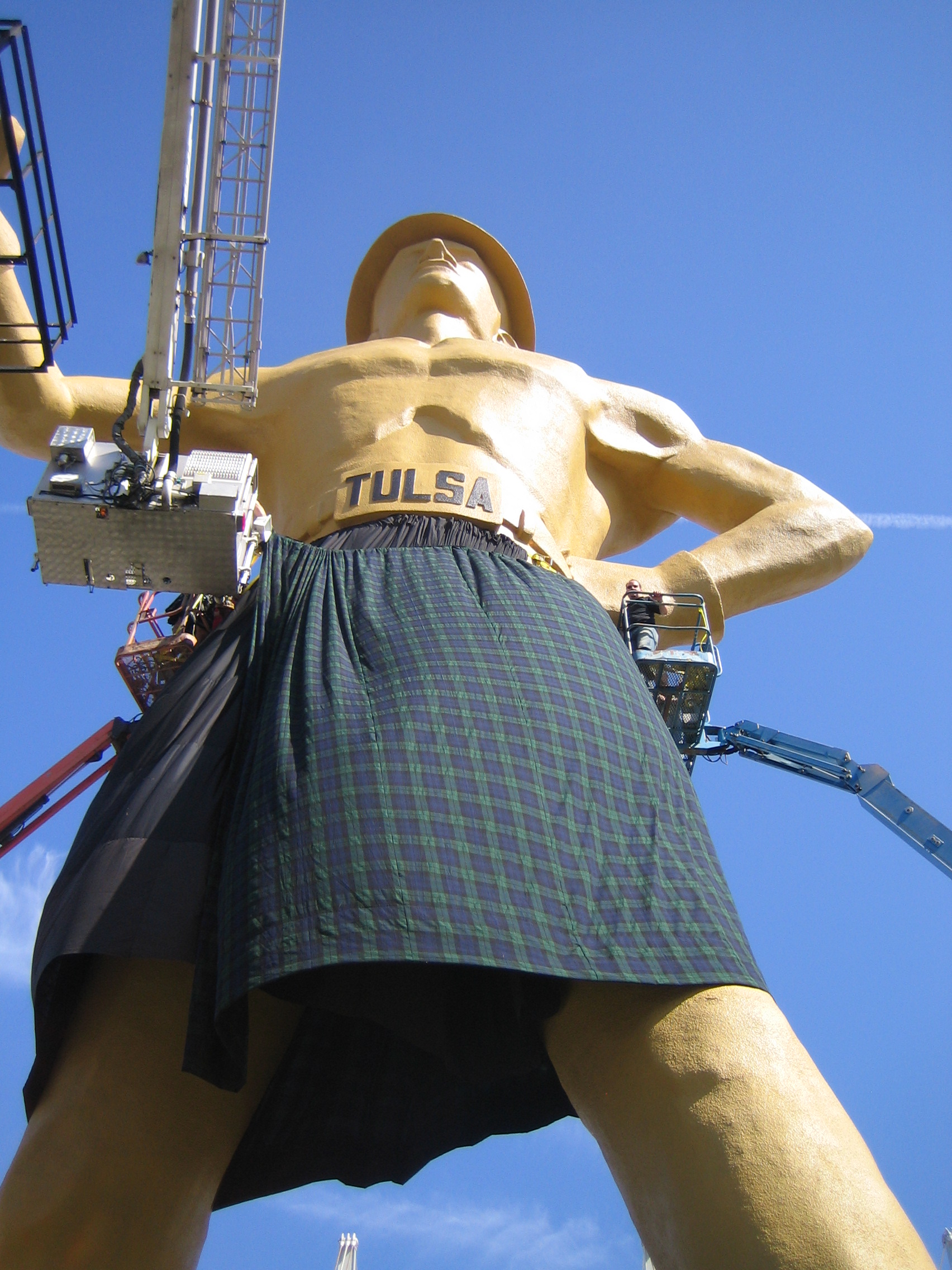 Some stats: 177 yards of Black Watch tartan with full pleating at the rear per a normal philibeg. He's 22.6 feet around his waist (below the Tulsa belt buckle) and getting it up above his bum was the single hardest part! Tulsa Fire Department actually made it work in addition to the two extension lifts and without their help we would not have been able to cinch it up and make it look proper. We left it in place for one week and then took it down and brought it out to the field where our Games are held annually for display.