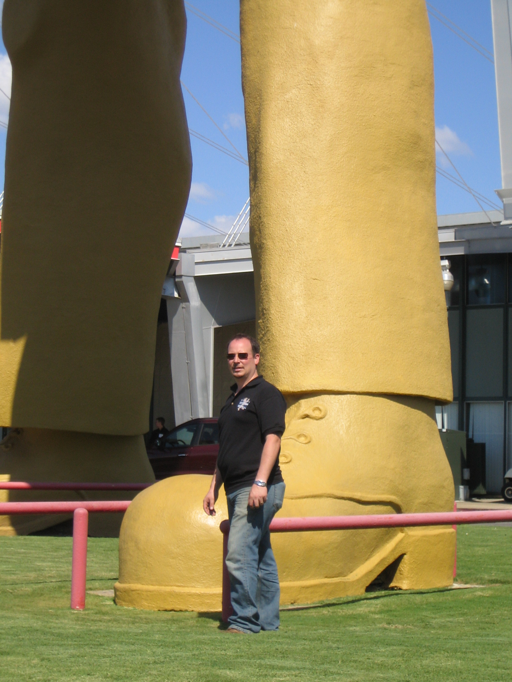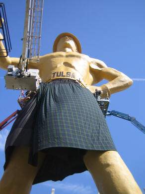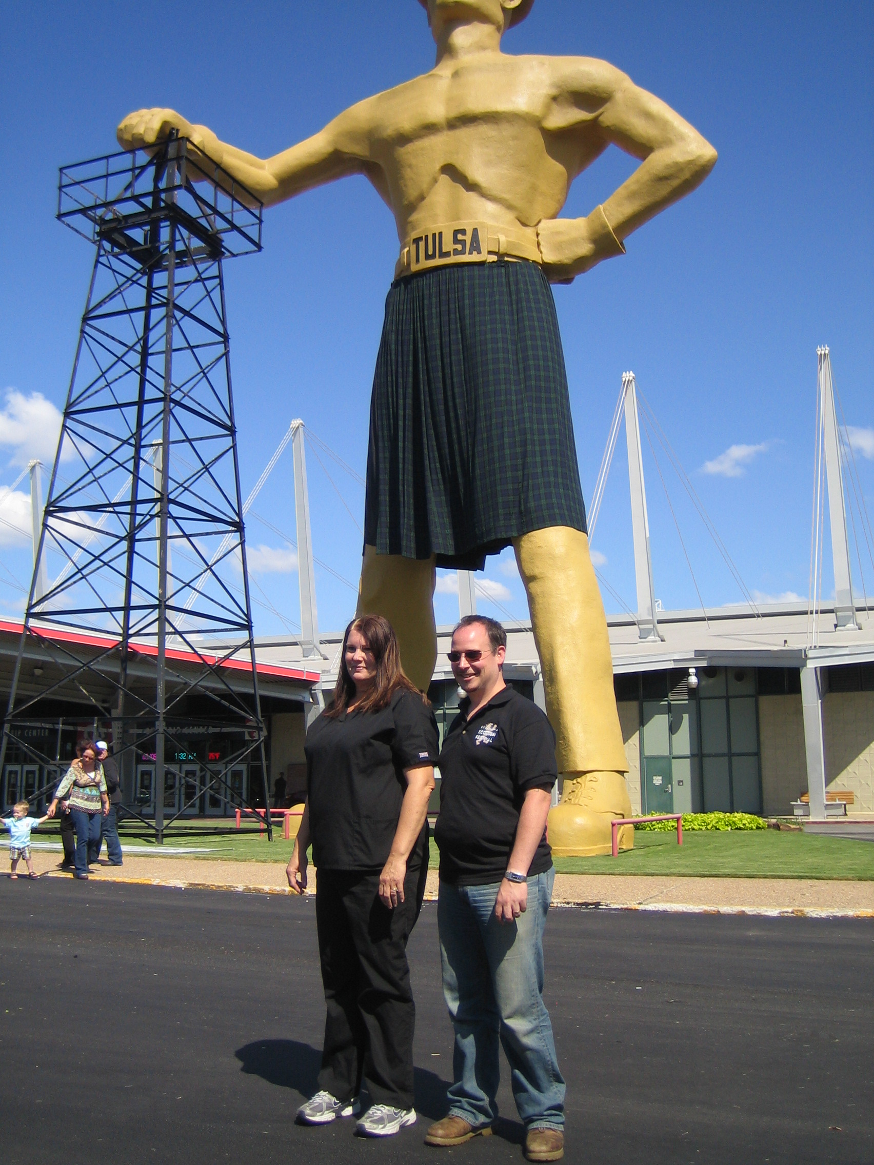 Here is the pic of Steven Campbell and Judy McLain by the Tulsa Golden Driller wearing his new World's Largest Kilt. Steven Sewed up the Kilt and is also Managing Director of the Oklahoma Scottish Festival and Judy McLain sewed in the massive pleats.