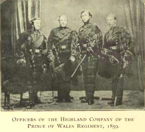 In 1860 the Commissioned Officers were: John Macpherson, Captain; Peter Moir, Lieutenant: George Brown, Ensign ; Alex. Graham Lindsay. Supernumerary Ensign. Non-Commissioned Officers: Colour Sergeant, James Stenhouse Sergeants, Thomas McWilliams, David Laurie, W. C. Slack, James Scott, John Villock. James Ridley: Corporals: Walter McGrath, Murdoch McKenzie, John Buchanan, Robert Slater, Donald Hamilton; Pipers: James Macdonald and Archibald McGinnis: Bugler, Ashley Cole.