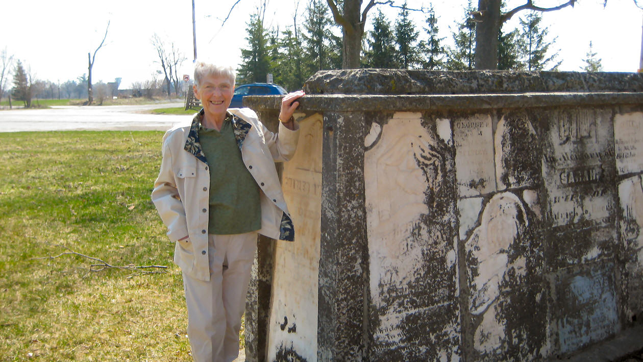 In April, 2008, the Kirkwood’s took the author of these lines on a tour of our rockside and ballinafad roots. Alan K. served as guide and described in detail the different farms, lots and pioneer highlights. On the left, Alan, Jim and Marion Smeaton Kirkwood visit the burial plots of their rockside ancestors. Below right, Marion S. Kirkwood is seen with Marion Kirkwood, life partner of Jim Kirkwood. Below left, Marion S. Stands beside a monument at the heritage Providence Cemetery in Ballinafad.