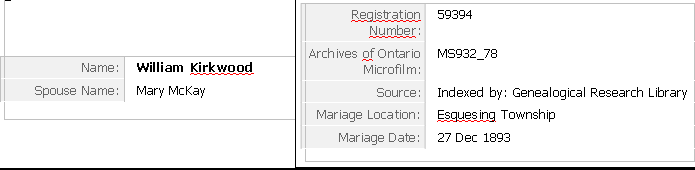 In Update 54, we introduced you to the Rockside Pioneers who first pioneered the region of Caledon by introducing you to Robert Crichton’s wonderful book. In reply to my query, Jim Kirkwood, great grandson of Donald McKay of Fallbrook and son of James P. Kirkwood of Ballinafad wrote ``yes, Wm Kirkwood, my grandfather married Mary McKay, she was born 1871; don't have the year of marriage, but their first child Oliver was born 1896. Yes Wm Kirkwood was definitely an ancestor of mine.