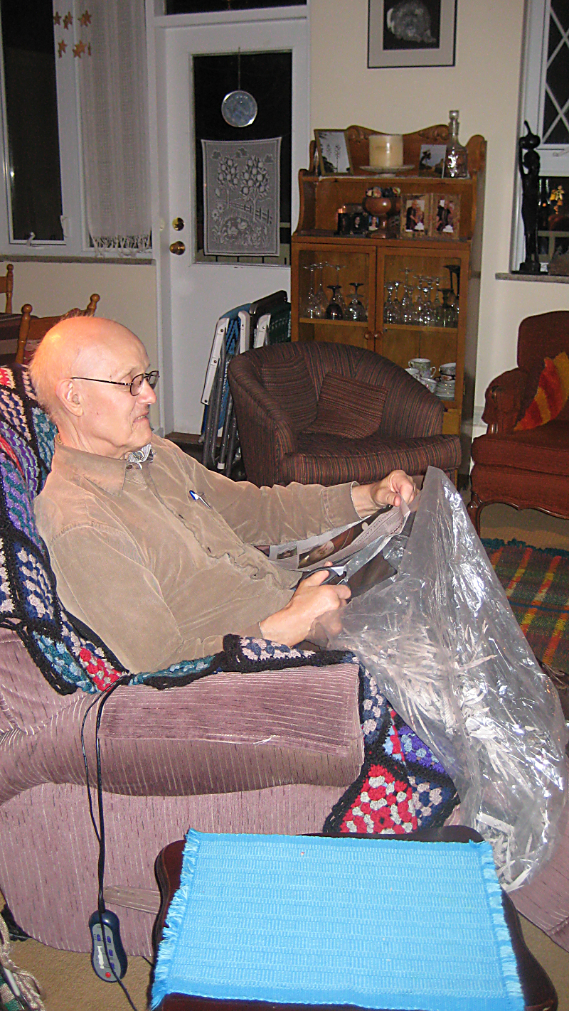 Jim and Marion Kirkwood in their comfortable home in the heart of Toronto. Jim archives precious pictures while Marion displays a sample of her colourful weaving.