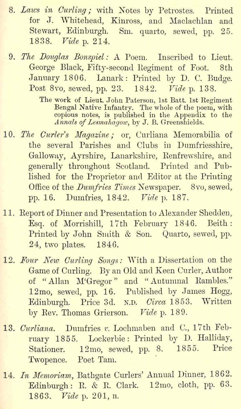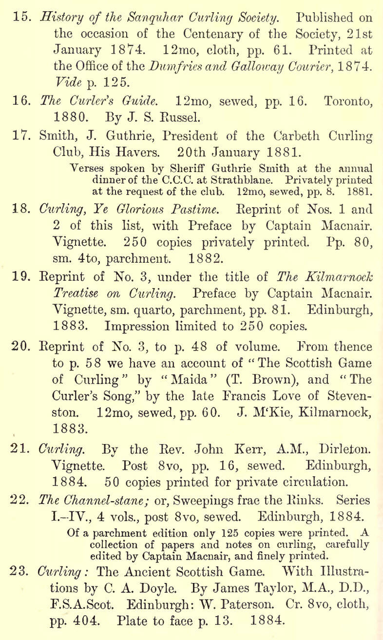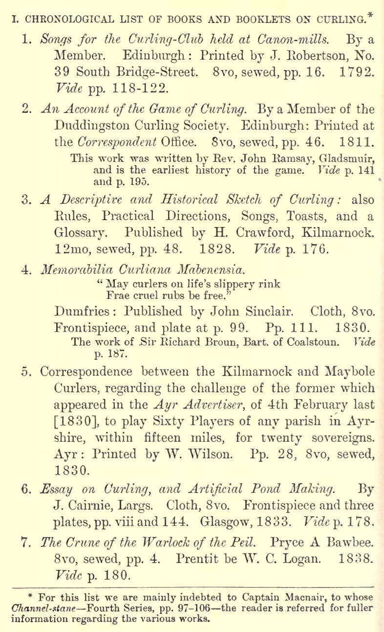 N the course of our history of the game we have given an account of the various works which have been written on the subject of curling. We should like to see curling literature further enriched by the histories of local clubs. Sanquhar and North Woodside have led the way, and the .history of Rattray Club is now in the hands of the Rev. Mr Davies, the club's chaplain. Such local records furnish us with interesting; information; and it is to these that we must look for sucIi fresh intelligence about the past as may at some future time help to improve this volume, or create the necessity for a fuller account of the history of the national game. The curler who is anxious to have a complete library of curling literature as one of his "equipments," will find such a worthy ambition no easy task, and if he is of Grangerite tastes he may have his time fully occupied in bunting up all the publications connected in one way or another with curling ; but for those who wish to limit their attention to works devoted in whole or in part to the game, we shall here furnish such lists as shall enable them to make a pretty exhaustive collection of curling literature.
