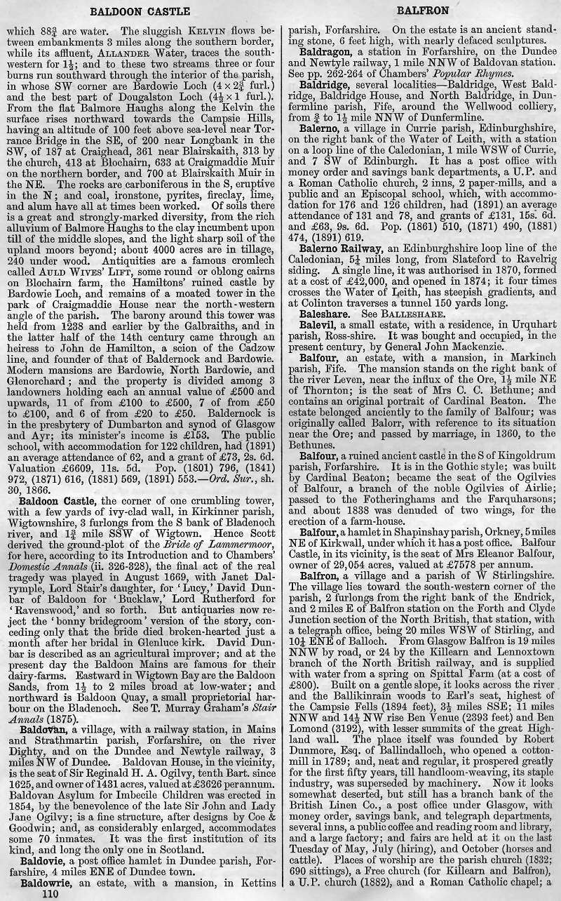 Baldoon Castle, Baldovan, Baldovie, Baldowrie, Baldragon, Baldridge, Balerno, Balerno Railway, Baleshare, Balevil, Balfour, Balfron