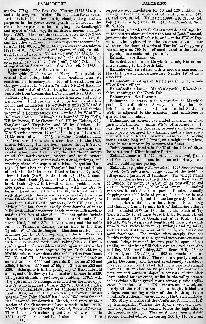 Balmaduthy, Balmaghie, Balmaha, Balmain, Balmakelly, Balmakewan, Balmalcolm, Balmaleedie, Balmangan, Balmanno, Balmaqueen, Balmashanner, Balmerino