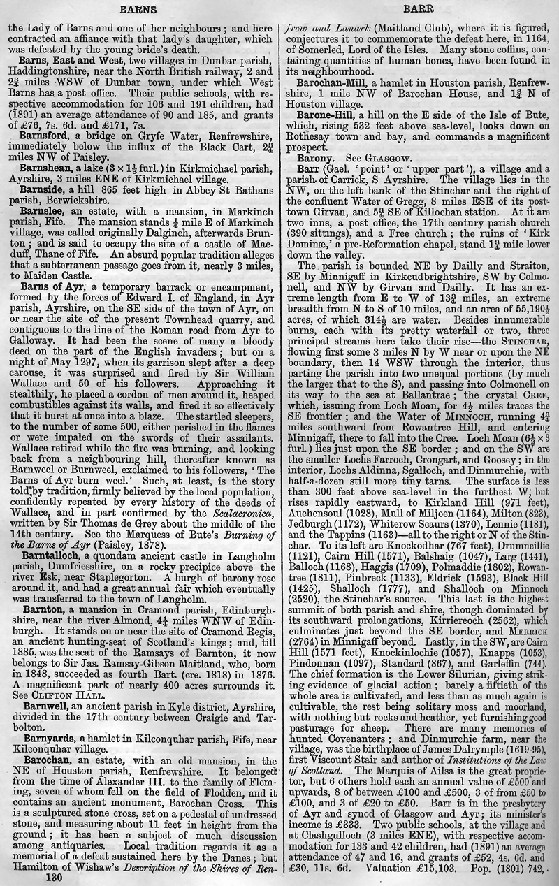 Barns - East and West, Barnsford, Barnshean, Barnslee, Barns of Ayr, Barntalloch, Barnton, Barnwell, Barnyards, Barochan, Barochan-Mill, Barone-Hill, Barony, Barr