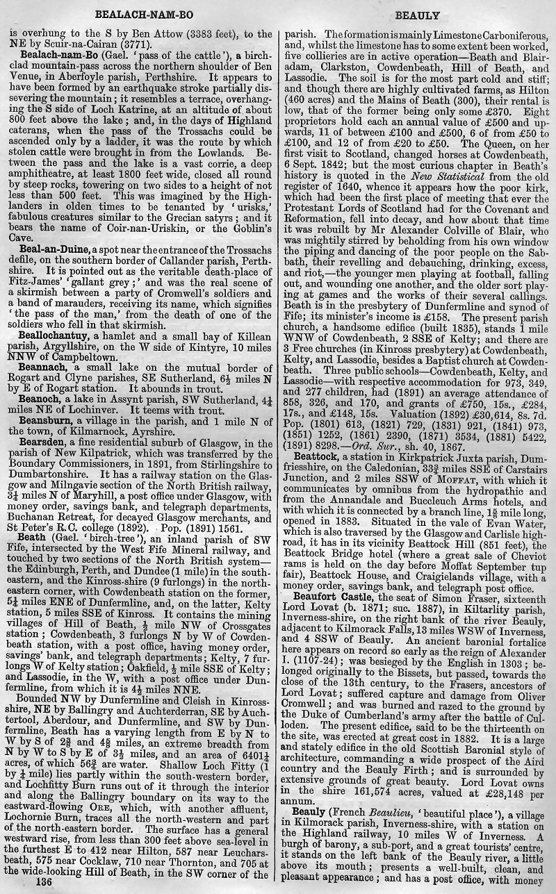 Bealach-nam-Bo, Beal-an-Duine, Beallochantuy, Beannach, Beanoch, Beansburn, Bearsden, Beath, Beattock, Beaufort Castle, Beauly