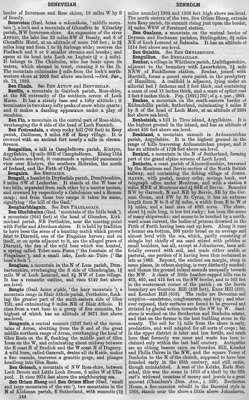 Beneveian, Ben Fhada, Benfile, Ben Fin, Ben Freiceadain, Bengaillan, Bengairn, Bengall, Bengharbhlagain, Ben Ghulbhlagain, Benglass, Benglo, Bengnuis, Ben Goleach, Ben Griam Bheag and Ben Griam Mhor, Ben Gualann, Ben Gulabin, Bengullion, Benhar, Benhee, Benheinish, Benhiand, Benhiel, Benholm